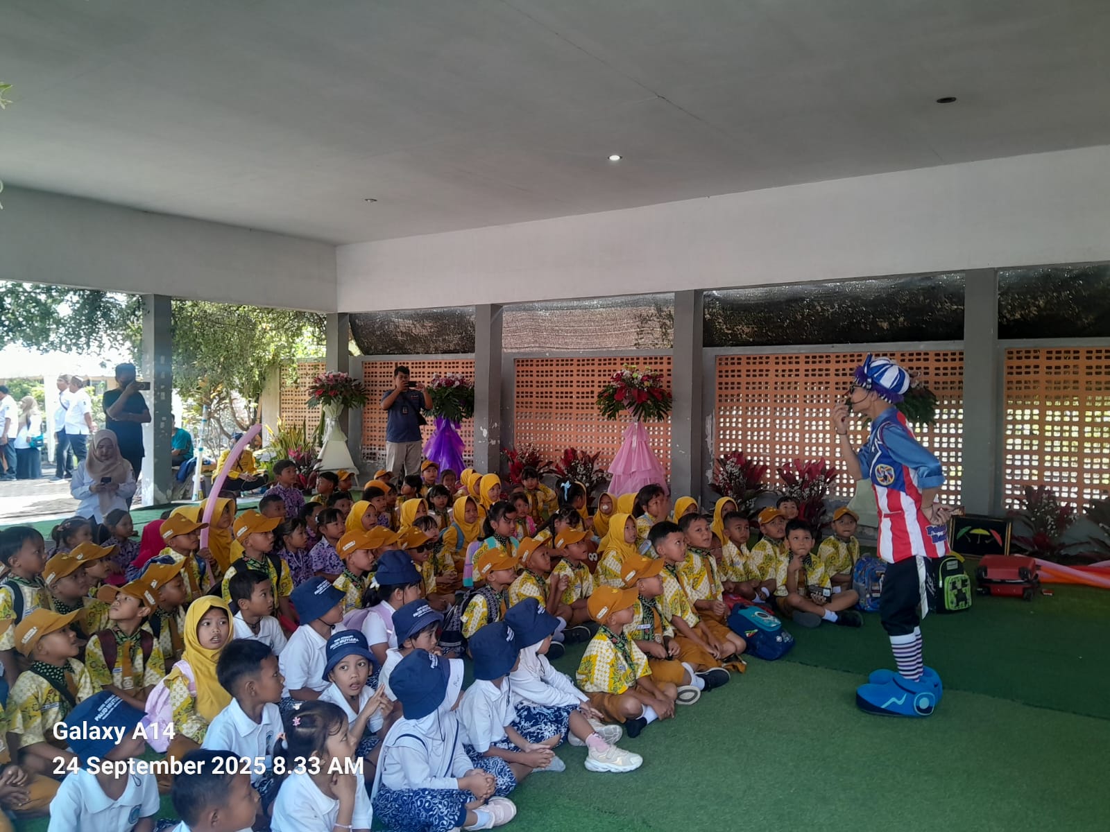 Sambil menanti kedatangan Bupati Banyuwangi Ipuk Fiestiandani, siswa siswi di hibur oleh badut dengan menyajikan berbagai macam mainan.