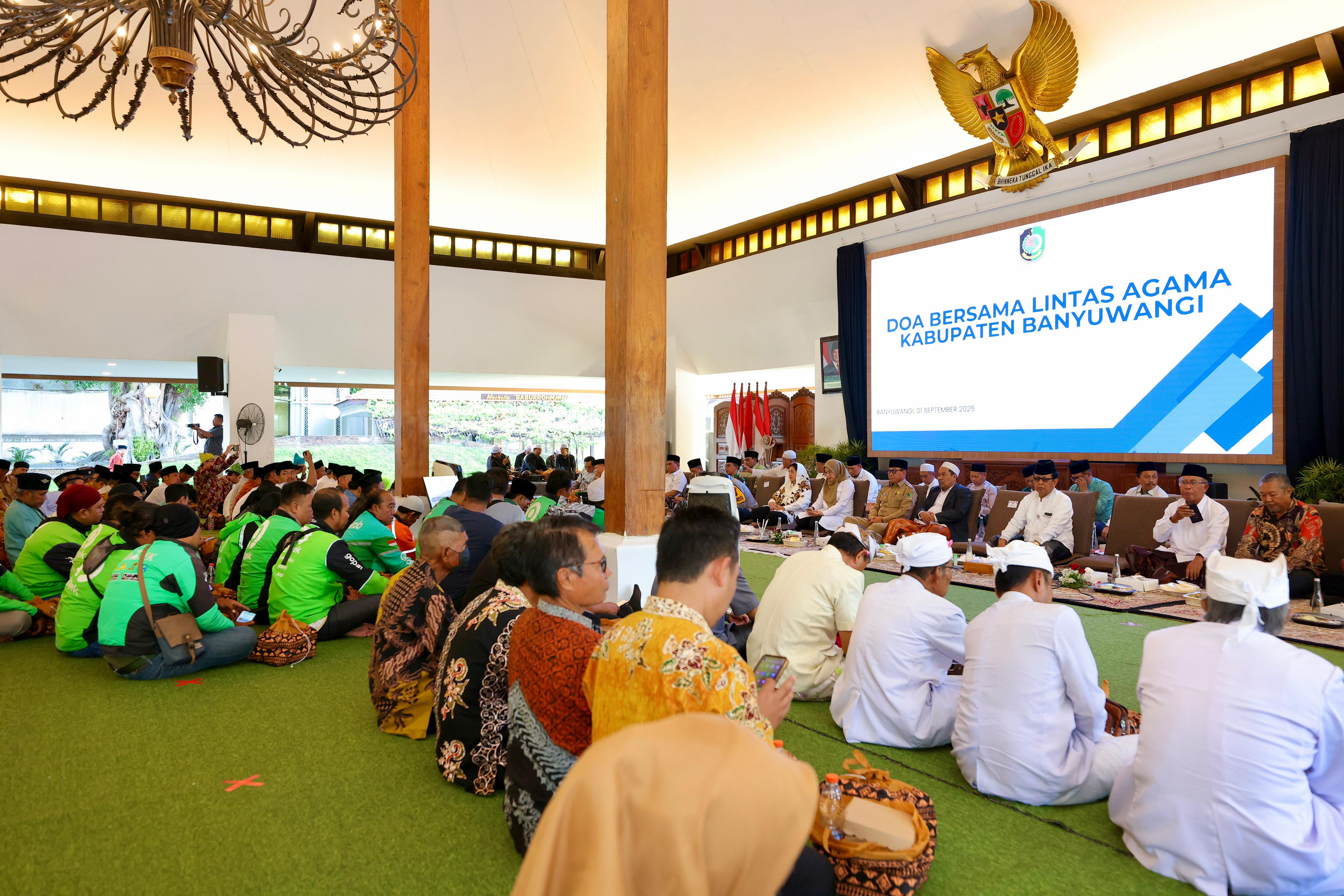 Banyuwangi - Berbagai elemen masyarakat menggelar doa bersama di Pendopo Shaba Swagata Blambangan Kabupaten Banyuwangi, Senin (1/9/2025). Mereka mengumpulkan harapan kepada Tuhan Yang Maha Esa untuk menjaga perdamaian kabupaten di ujung timur Pulau Jawa tersebut.